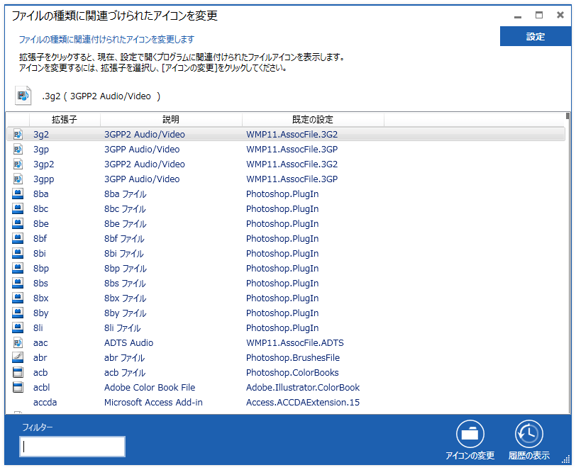 ファイルの種類に関連づけられたアイコンを変更は、Windows 8 デスクトップ(7, Vista)用で、ファイル(拡張子)に関連づけられたアイコンを変更するアプリです。